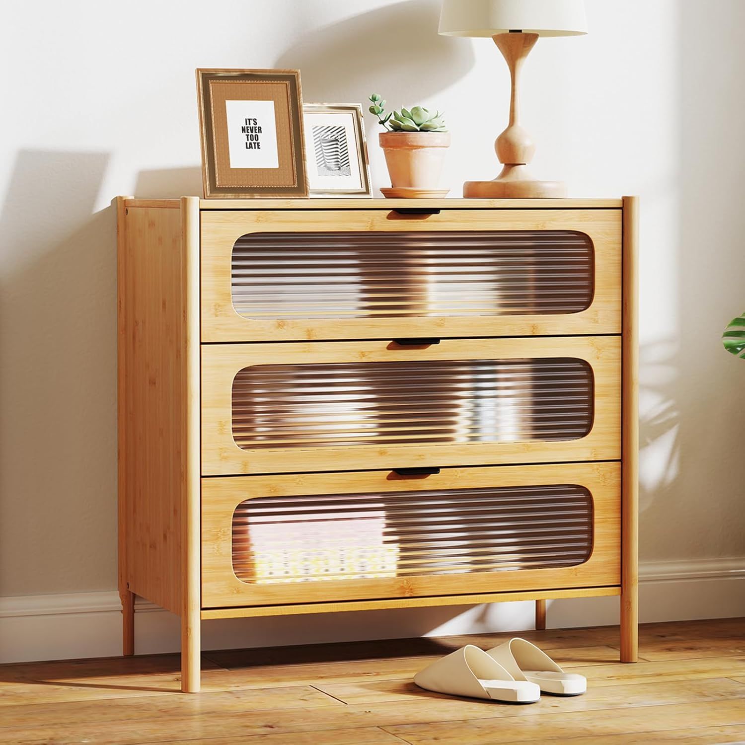 Storage Cabinet: This cabinet includes three slide-out drawers, keeping items concealed yet accessible. The spacious top provides a display area for books, plants, and decorative items. Durable Materials: Made from natural bamboo, known for strength and durability, this four-drawer dresser is a reliable addition to your home. The polished surface enhances its lifespan. Glass Drawers: Each drawer has fluted tempered glass fronts, allowing easy viewing of contents. The metal handles and soft-close slides provide ease and quiet when opening the drawers. Stable & Safe Use: An anti-toppling device ensures safety, protecting the unit and contents. Support legs have non-slip pads for floor protection, raising the cabinet for easy cleaning. Versatile Usage: The natural finish offers a warm look that matches various interior styles. Suitable for living room, bedroom, study, or entryway. Note: Always secure this furniture with the provided anchor device. Never allow children to stand, climb, or hang on drawers, doors, or shelves.