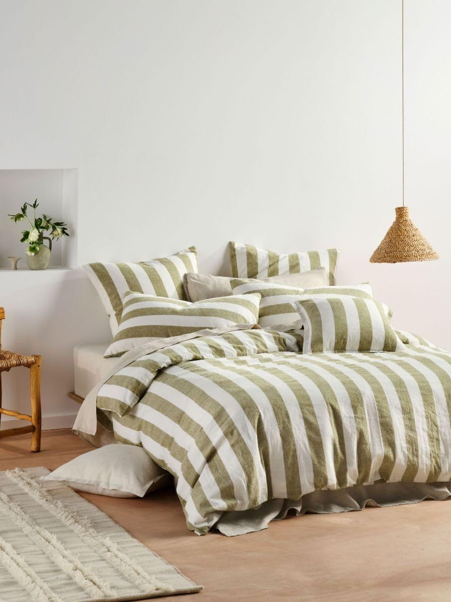 This quilt cover set features a washed linen cotton blend with a reversible stripe design in pesto. It includes coordinating European pillowcases and a cushion with tailored edges, providing a versatile and enduring style.